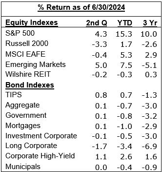 Other indices also failed to keep up with the S&P 500. Smaller U.S. stocks and international stocks trailed. These indices were up 1.7% and 5.3%, respectively. The old market adage, a rising tide lifts all boats, didn’t prove true. Even given the narrow leadership, most portfolios likely experienced reasonable advances for the first half.